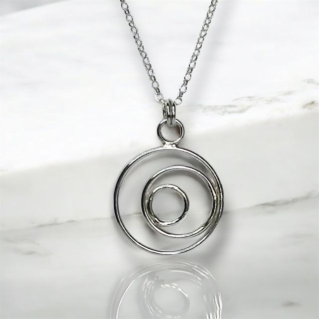 This Silver Circle Pendant is handcrafted and designed to catch the light beautifully. The pendant features a series of interconnected circles, creating a modern and elegant look. Make a statement with this chic accessory that effortlessly complements any outfit. The Silver Circle Pendant is a must-have addition to your jewellery collection.